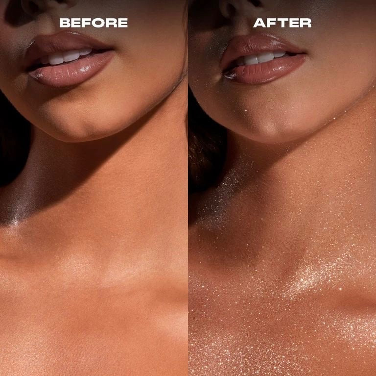 Shake the bottle well. Hold it 15–20 cm away from your body and lightly mist over clean, dry skin. For more sparkle, apply 2–3 light layers. Can also be used on hair, shoulders, or décolleté.